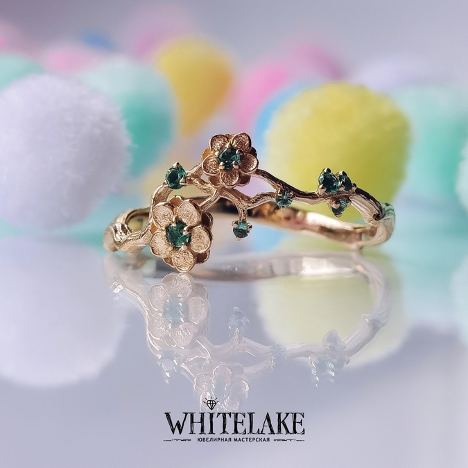 Кольцо с цветками Сакура в жёлтом золоте с изумрудами