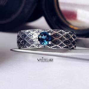 В качестве акцента мы выбрали голубой топаз London Blue, цвет которого идеально сочетается с черненым серебром.