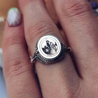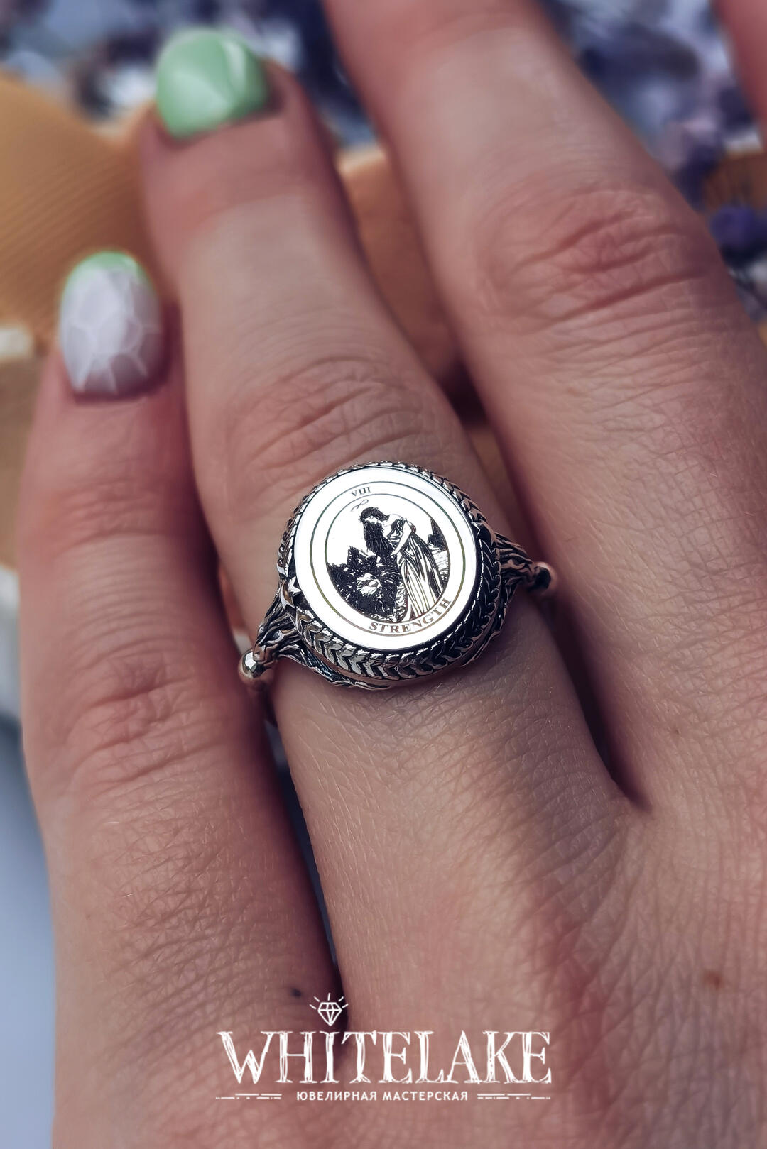 WHITELAKE Кольцо с картой Таро «Сила» Кольцо с картой Таро «Сила» на заказ по своим и нашим эскизам. Изготовление ювелирных украшений из золота и других металлов с доставкой по всей России. Ювелирная студия Whitelake: каталог и цены на сайте.