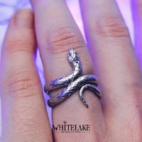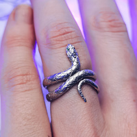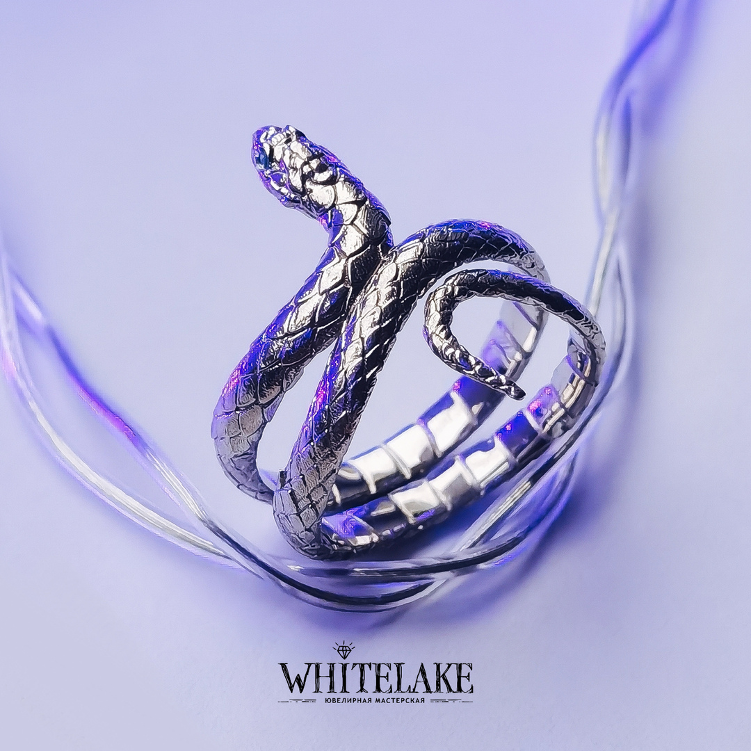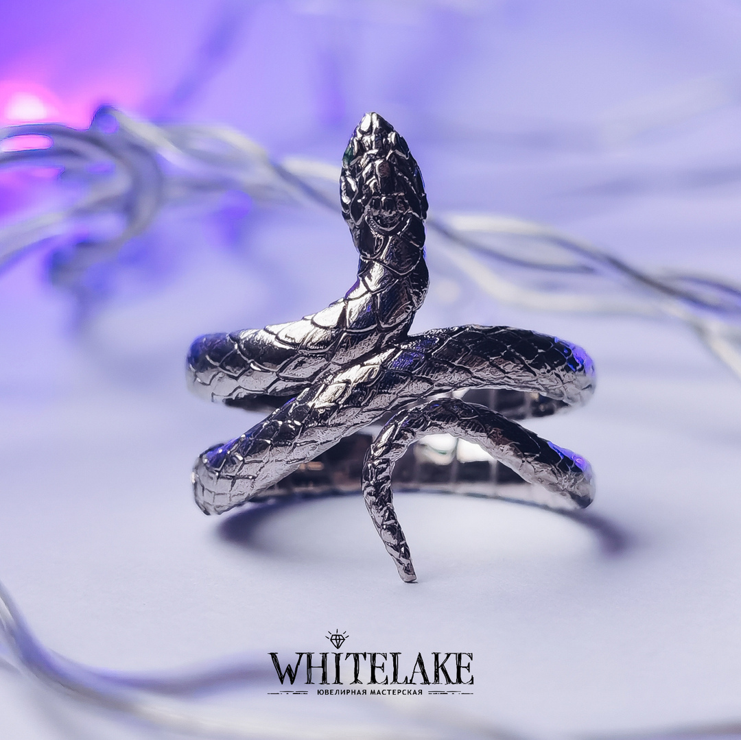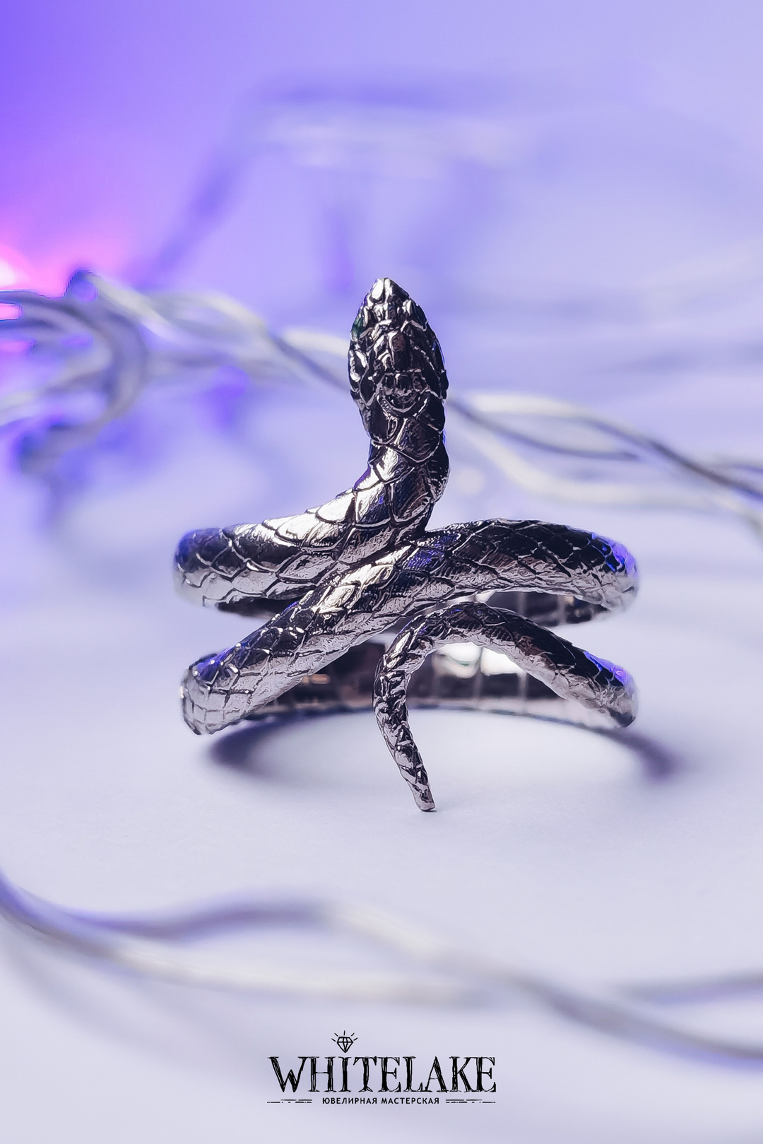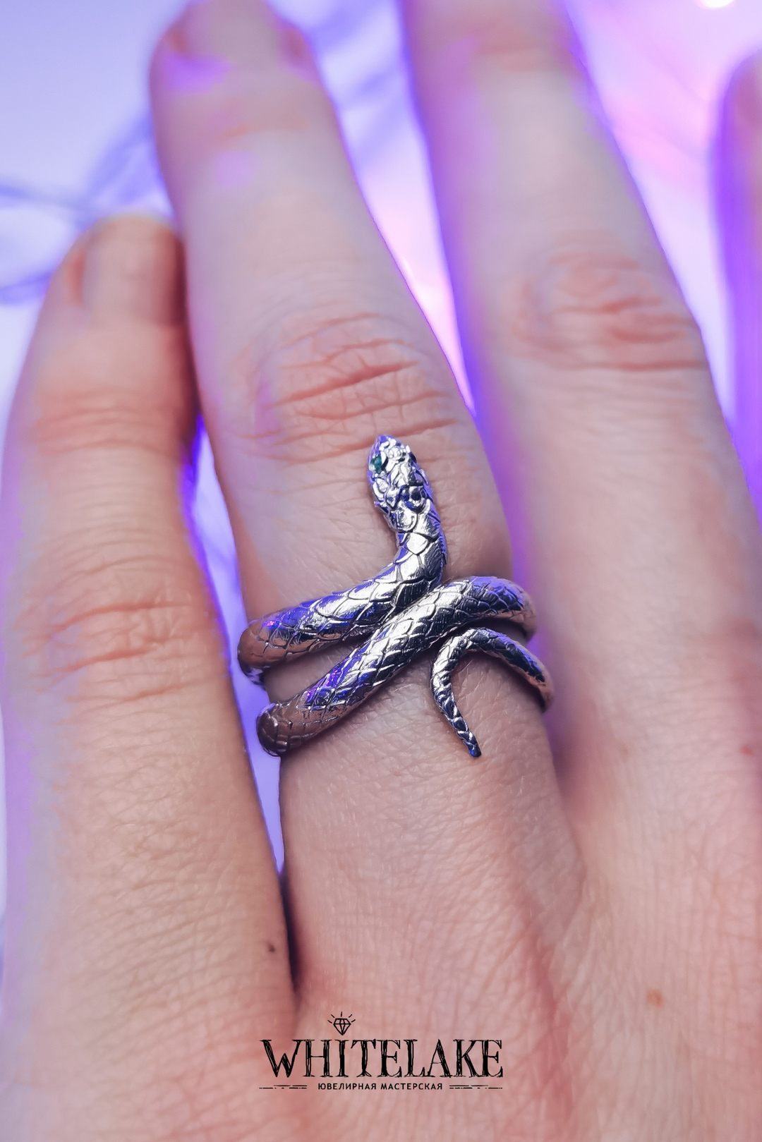 Мы изготовим под ваш размер такое же изделие, учитывая все пожелания к дизайну. Змейка может быть абсолютно любая: например, кобра, с открытой пастью, высунутым языком и т.д. Ширина кольца, количество оборотов змеи вокруг пальца, даже форма чешуи – каждая деталь обсуждается заранее.