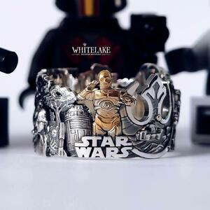 В украшении сочетаются все классические образы саги. Чубакка и Хан Соло. Учитель Йода и Дарт Вейдер. Роботы R2-D2 и C-3PO. Принцесса Лея. Звезда Смерти, герб повстанцев и множество других деталей, так хорошо знакомых настоящим фанатам «Звездных войн». Мы старались максимально точно следовать канону, чтобы образы узнавались с первого взгляда. Надеемся, что у нас получилось, и это кольцо станет замечательным подарком для вас или вашего близкого человека.
