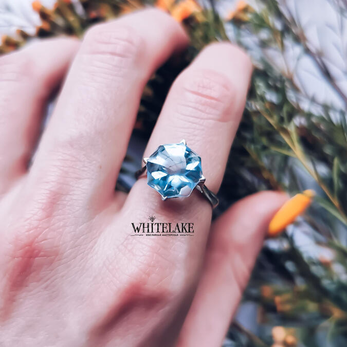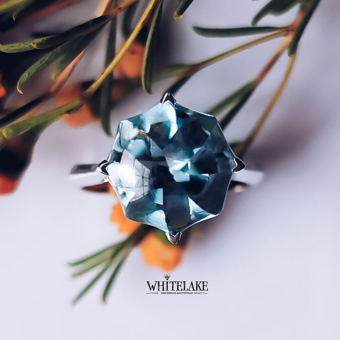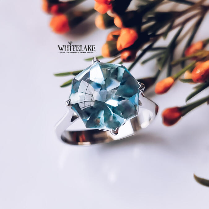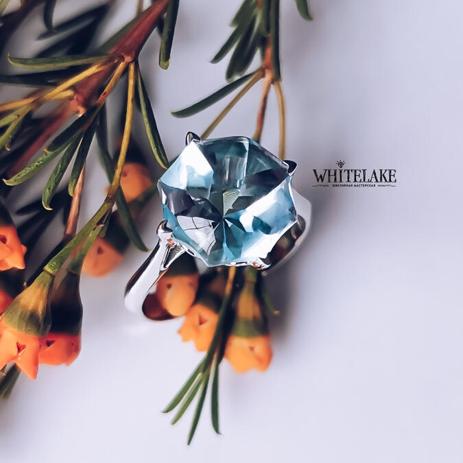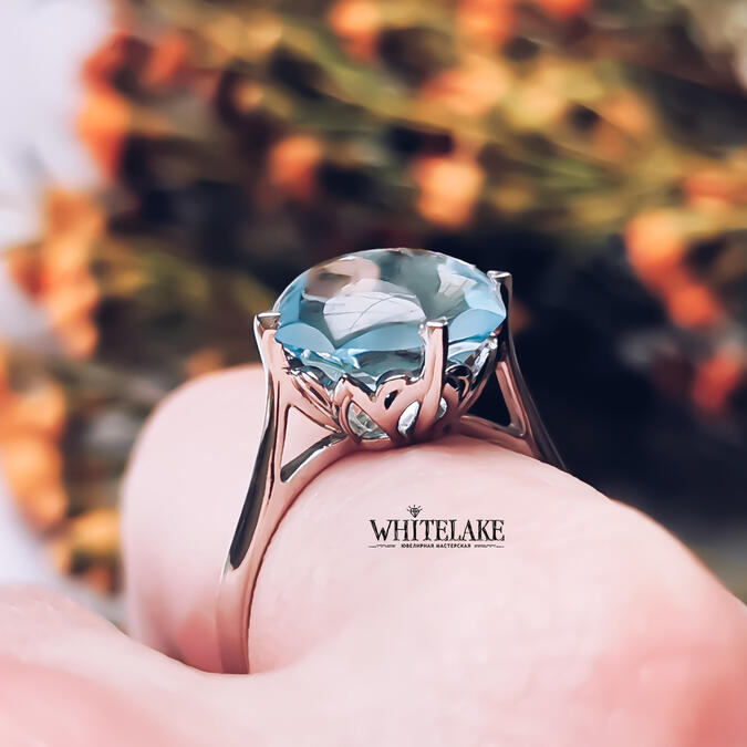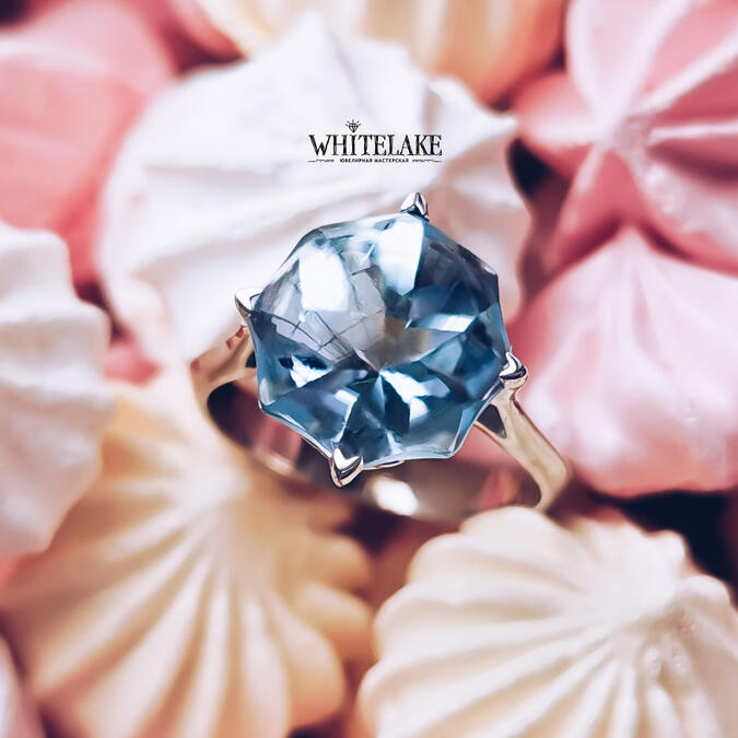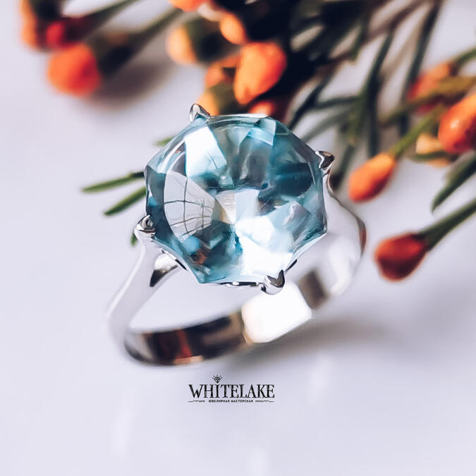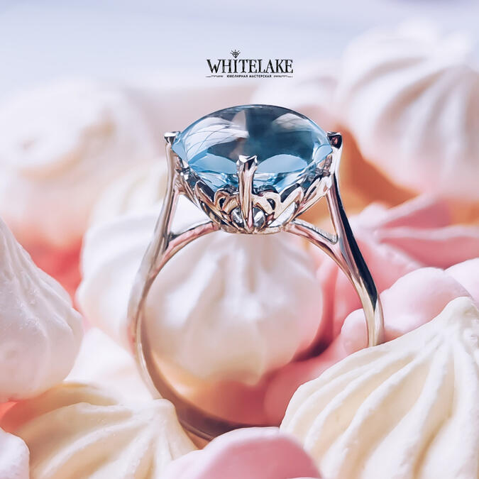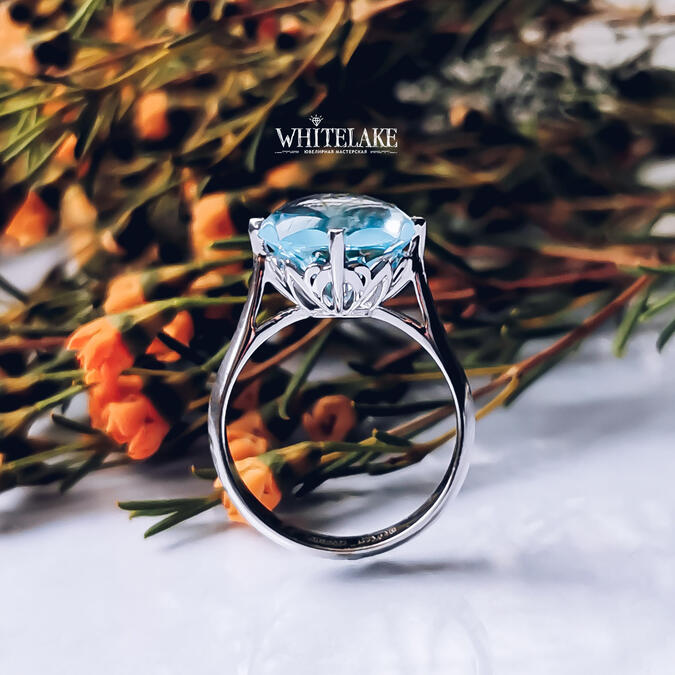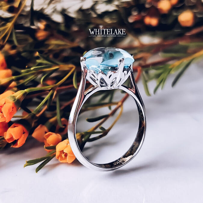 Шикарное кольцо из белого золота с голубым топазом
