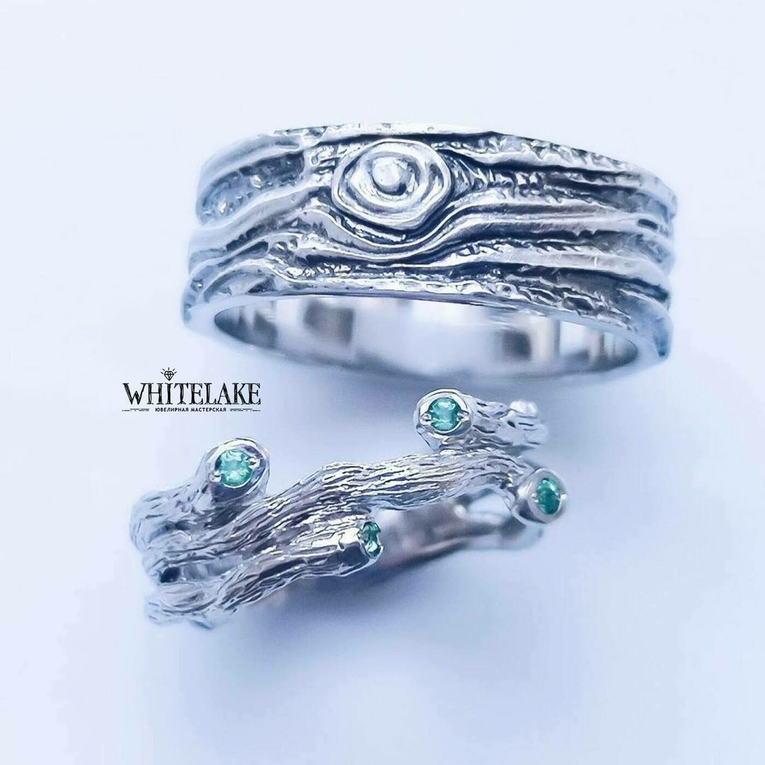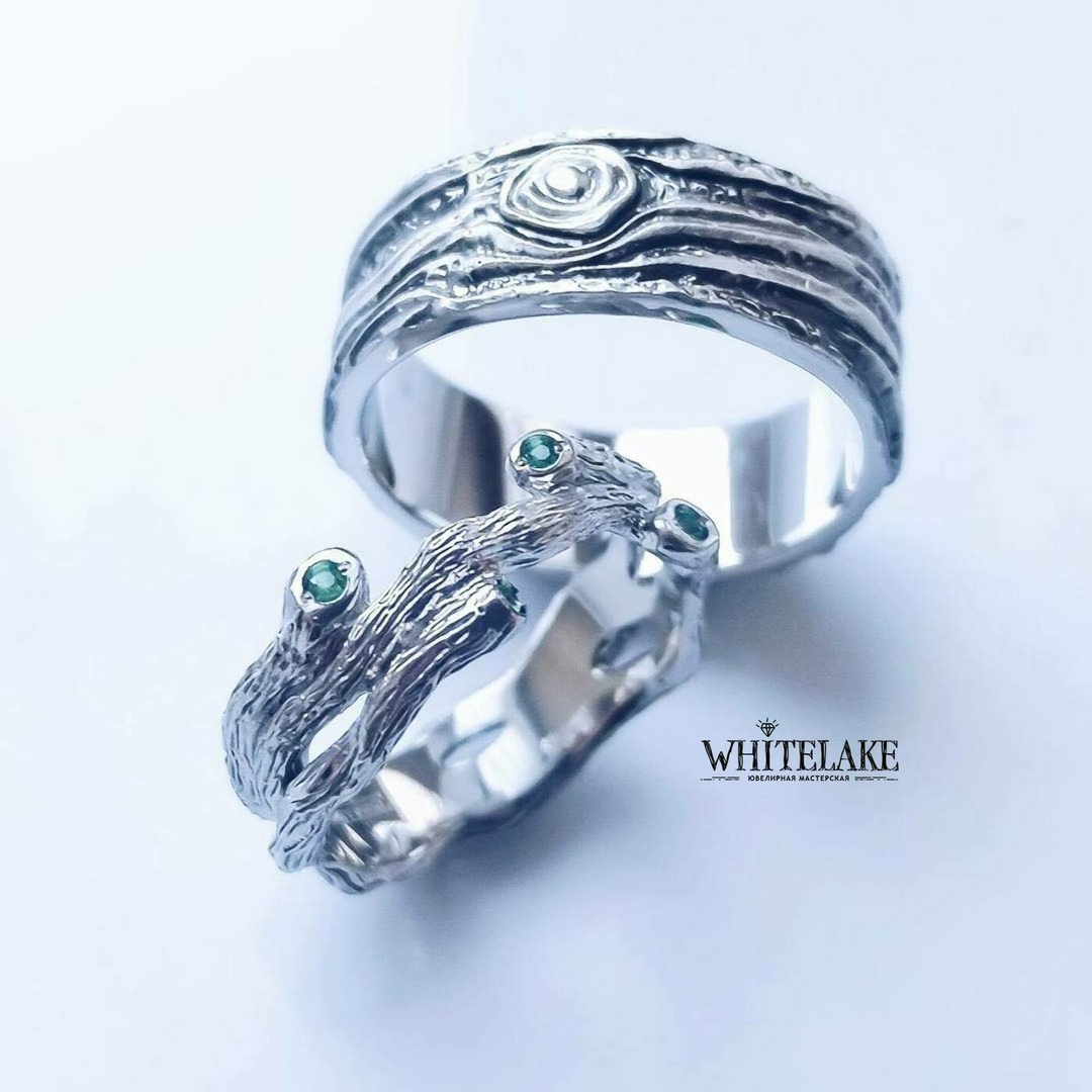 WHITELAKE Древесные обручальные кольца с изумрудами Древесные обручальные кольца с изумрудами - на заказ. Изготовление эксклюзивных колец в ювелирной студии Whitelake с доставкой по России. Создаем уникальные ювелирные украшения по своим и вашим эскизам из золота, платины и серебра с драгоценными и полудрагоценными камнями и гравировкой.