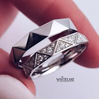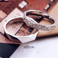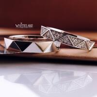Строгость линий, игра выверенных граней смягчается искрящимся блеском драгоценных камней на тонком женском кольце. Мужское, напротив, более нейтральное и официальное уравновешивает дуэт. Эстетика этой пары недвусмысленно даёт понять, что со вкусом у их обладателей всё в порядке. Уверенные в себе, сильные и красивые – правильные слова для описания колец и их владельцев.