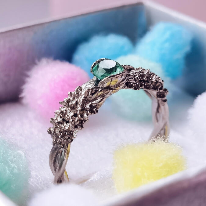 Помолвочное кольцо с изумрудом «Листья сирени»