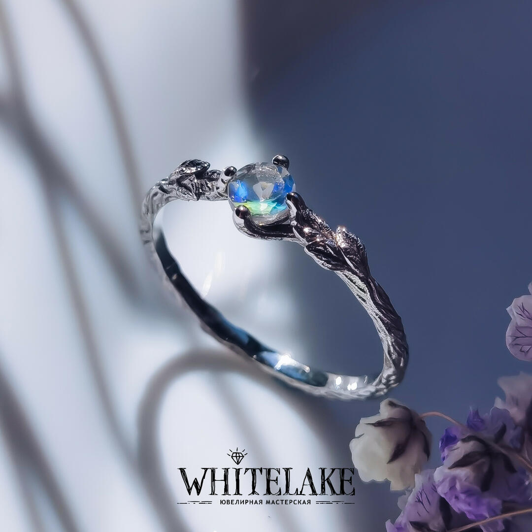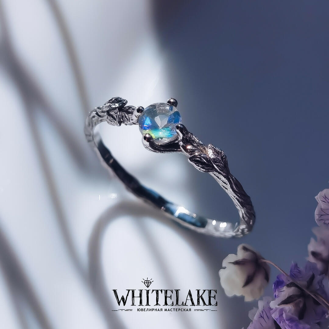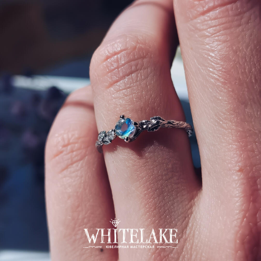 - Кольцо для помолвки в виде веточки с лунным камнем