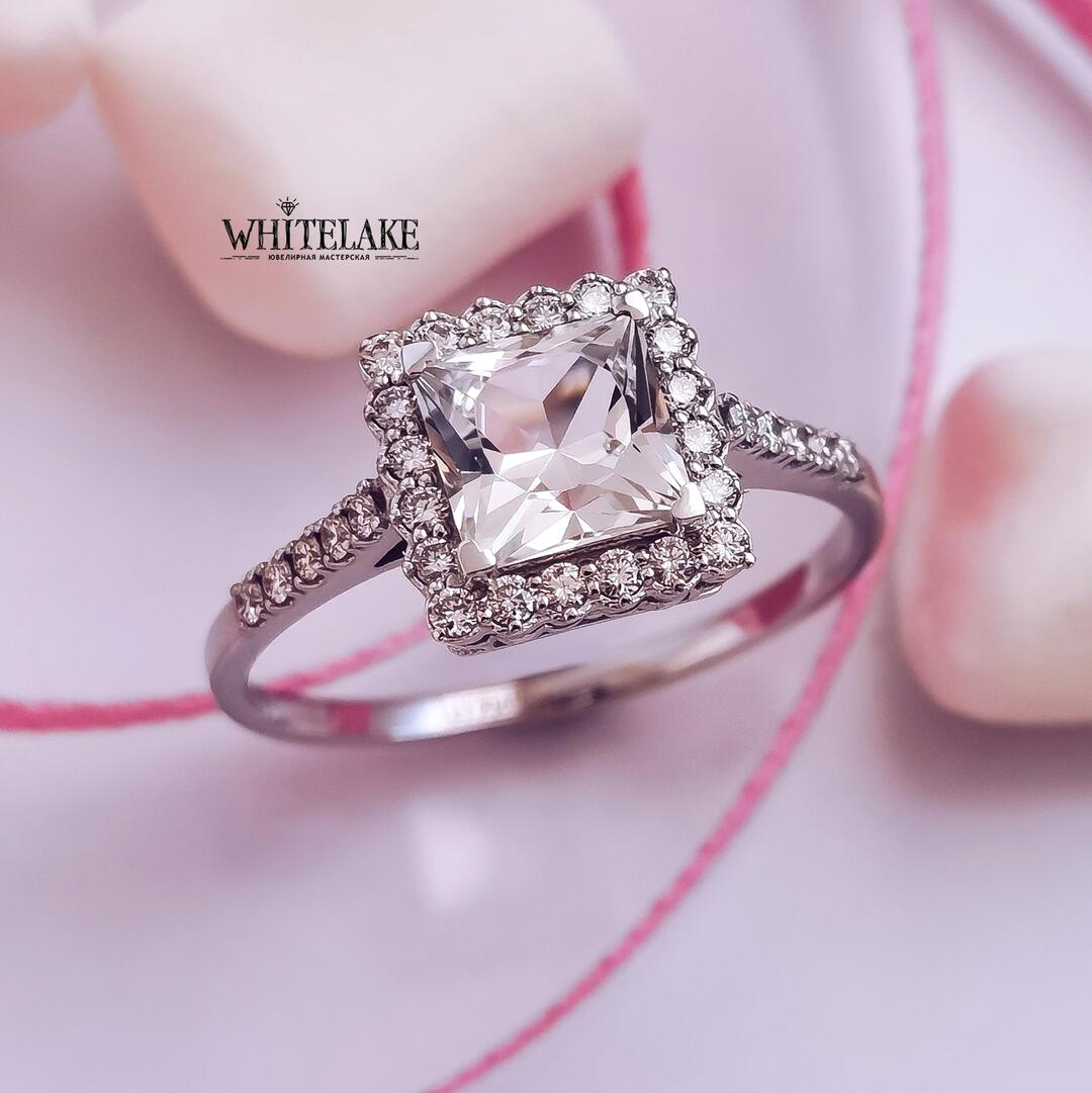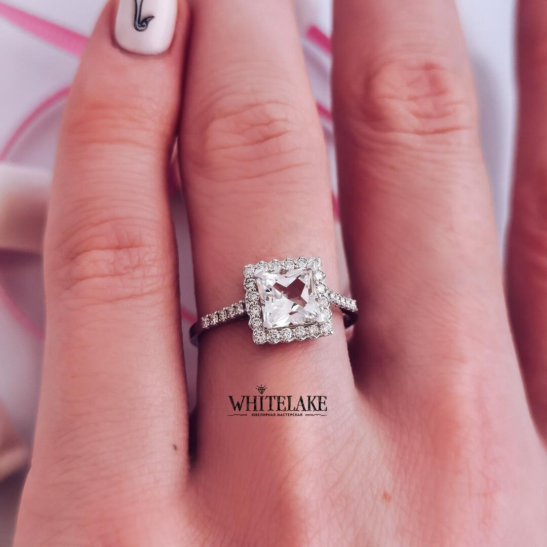 - Кольцо для предложения с бесцветным топазом огранки принцесса